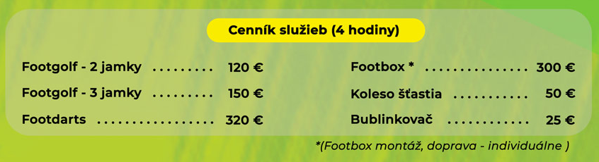 Golf s futbalovou loptou. Spojenie futbalu a golfu s prenosnými jamkami. Ideálne ako stanovište na klubových akciách, či tréningu na zlepšenie kopacej techniky a presnosti prihrávok. Vašu akciu môže obohatiť aj svetová footgolfistka Lucka Čermáková, ktorá vysvetlí pravidlá, ukáže techniky kopu a zahrá si s účastníkmi.